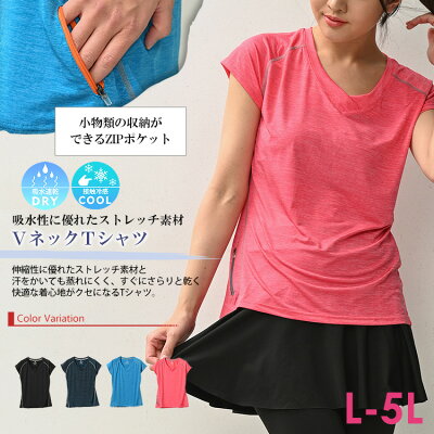 メール便対応 吸汗速乾ストレッチVネックTシャツ 半袖 スポーツウェア ストレッチ ジム フィットネス LL 3L 4L 5L ゆったりサイズ ぽっちゃり女子 プラスサイズ