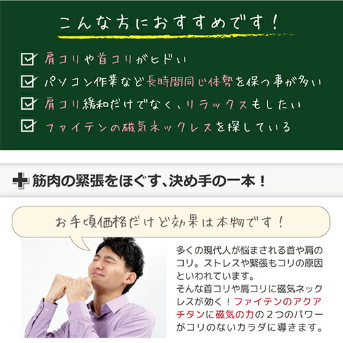 ギフト対応について 肩こりに効くファイテンの磁気・チタンネックレス サイズ 45cm 55cm カラー ブラック/レッド/ピンク/グリーン/イエロー 品質・素材 シリコーン、磁石 区分/製造 医療機器/日本製 医療機器認証番号 225AGBZX00063000 広告文責 株式会社夢・八天03-5834-8108 メーカー ファイテン株式会社 注意事項 ※開封後の返品・交換は別途手数料がかかります。